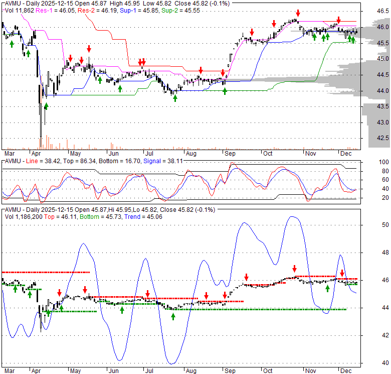 Price has closed below its short-term moving average. Short-term moving average is currently below mid-term; and above long-term moving average. From the relationship between price and moving averages: This stock is BEARISH in short-term; and NEUTRAL in mid-long term.[ AVMU ] has closed above bottom band by 24.3%. Bollinger Bands are 39% narrower than normal. The current width of the bands does not suggest anything about the future direction or movement of prices.