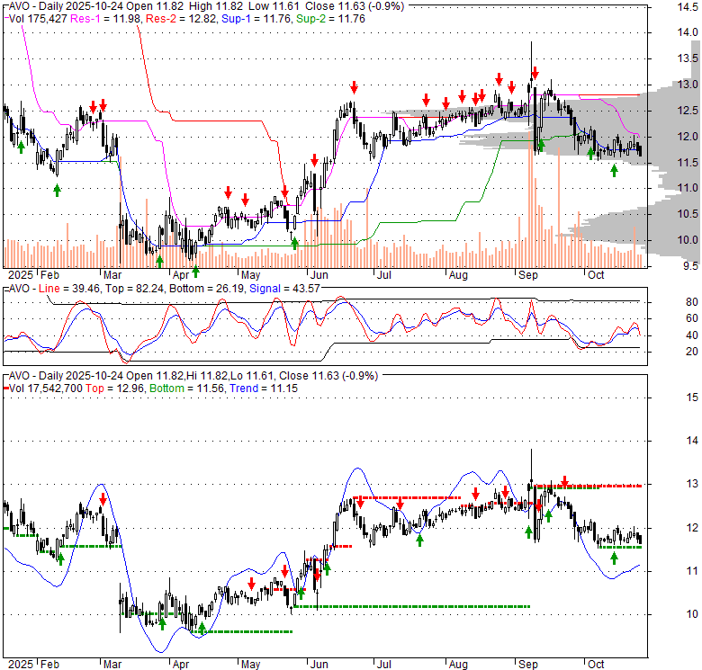 Price has closed below its short-term moving average. Short-term moving average is currently below mid-term; and below long-term moving average. From the relationship between price and moving averages: This stock is BEARISH in short-term; and NEUTRAL in mid-long term.[ AVO ] has closed above bottom band by 12.0%. Bollinger Bands are 65.4% narrower than normal. The narrow width of the bands suggests low volatility as compared to its normal range. The bands have been in this narrow range for 6 bars. This is a sign that the market may be about to initiate a new trend.