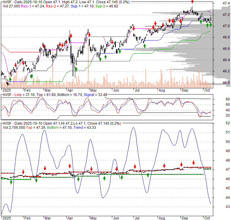 Price has closed above its short-term moving average. Short-term moving average is currently below mid-term; and above long-term moving average. From the relationship between price and moving averages: This stock is NEUTRAL in short-term; and NEUTRAL in mid-long term.[ AVSF ] has closed below upper band by 48.5%. Bollinger Bands are 31.4% narrower than normal. The current width of the bands does not suggest anything about the future direction or movement of prices.