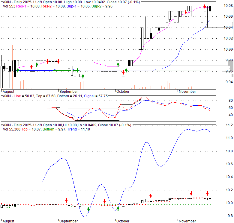 Price has closed below its short-term moving average. Short-term moving average is currently above mid-term; and below long-term moving average. From the relationship between price and moving averages: This stock is NEUTRAL in short-term; and NEUTRAL in mid-long term.[ AXIN ] has closed above bottom band by 40.2%. Bollinger Bands are 0% narrower than normal.