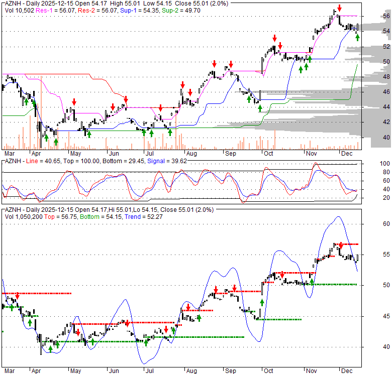 Price has closed above its short-term moving average. Short-term moving average is currently above mid-term; and above long-term moving average. From the relationship between price and moving averages: This stock is BULLISH in short-term; and BULLISH in mid-long term.[ AZNH ] has closed above bottom band by 48.4%. Bollinger Bands are 26.1% narrower than normal. The current width of the bands does not suggest anything about the future direction or movement of prices.