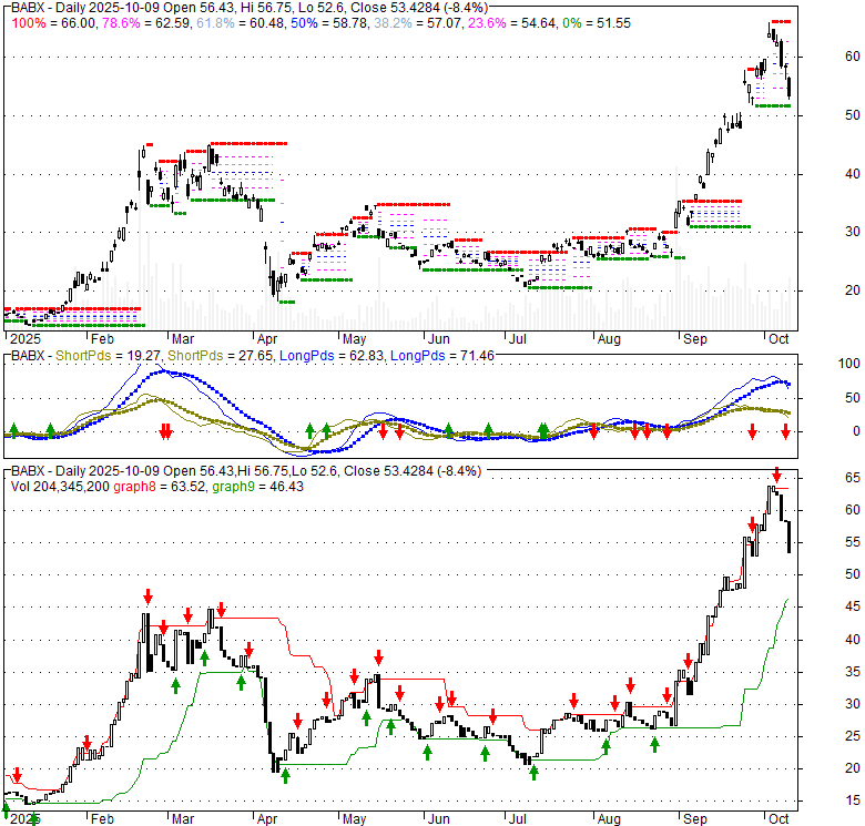 Price has closed below its short-term moving average. Short-term moving average is currently above mid-term; and above long-term moving average. From the relationship between price and moving averages: This stock is NEUTRAL in short-term; and BULLISH in mid-long term.[ BABX ] has closed above bottom band by 36.6%. Bollinger Bands are 96.3% wider than normal. The large width of the bands suggest high volatility as compared to its normal range. The bands have been in this wide range for 24 days. This is a sign that the current trend might continue.