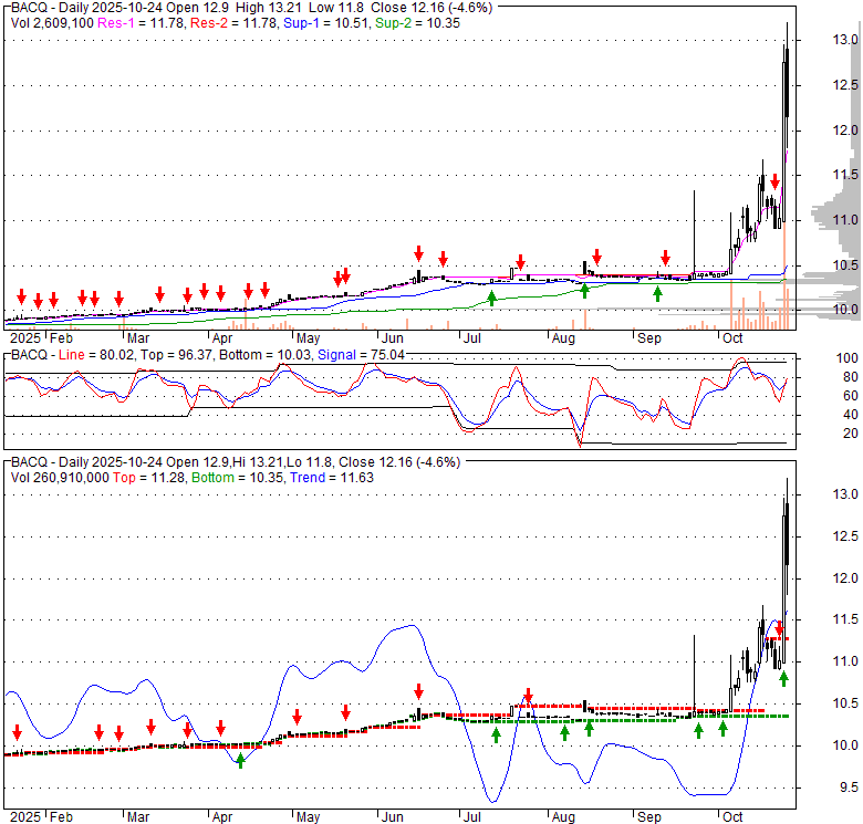 Price has closed above its short-term moving average. Short-term moving average is currently above mid-term; and above long-term moving average. From the relationship between price and moving averages: This stock is BULLISH in short-term; and BULLISH in mid-long term.[ BACQ ] has closed below upper band by 5.6%. Bollinger Bands are 687.1% wider than normal. The large width of the bands suggest high volatility as compared to its normal range. The bands have been in this wide range for 14 days. This is a sign that the current trend might continue.