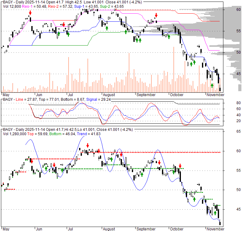 Price has closed below its short-term moving average. Short-term moving average is currently below mid-term; and below long-term moving average. From the relationship between price and moving averages: This stock is BEARISH in short-term; and BEARISH in mid-long term.[ BAGY ] has closed above bottom band by 4.5%. Bollinger Bands are 83.9% wider than normal. The large width of the bands suggest high volatility as compared to its normal range. The bands have been in this wide range for 6 days. This is a sign that the current trend might continue.