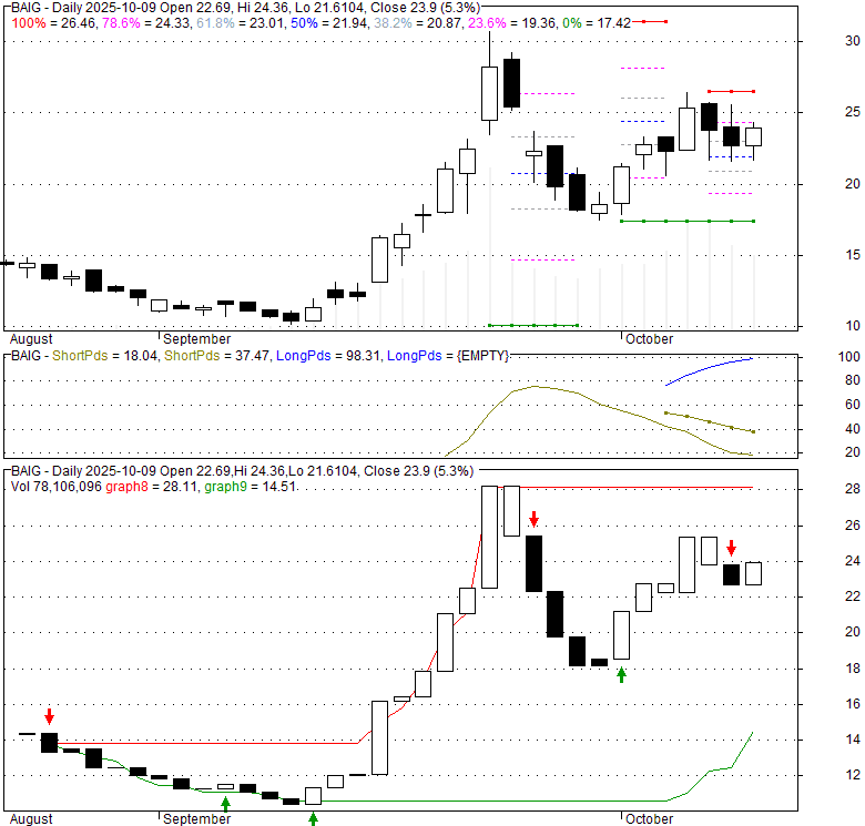 Price has closed below its short-term moving average. Short-term moving average is currently below mid-term; and below long-term moving average. From the relationship between price and moving averages: This stock is NEUTRAL in short-term; and NEUTRAL in mid-long term.[ BAIG ] has closed above bottom band by 45.6%. Bollinger Bands are 0% narrower than normal.