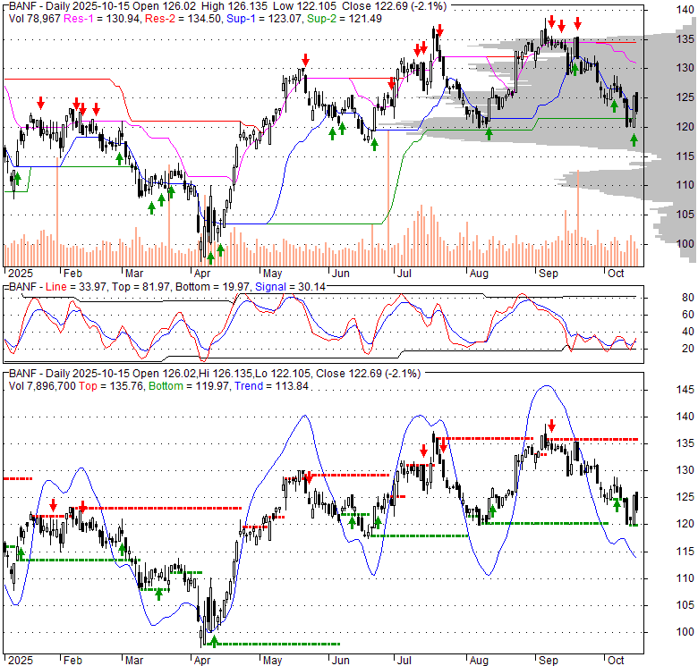 Price has closed above its short-term moving average. Short-term moving average is currently below mid-term; and below long-term moving average. From the relationship between price and moving averages: This stock is NEUTRAL in short-term; and NEUTRAL in mid-long term.[ BANF ] has closed above bottom band by 35.3%. Bollinger Bands are 1.5% wider than normal. The current width of the bands does not suggest anything about the future direction or movement of prices.