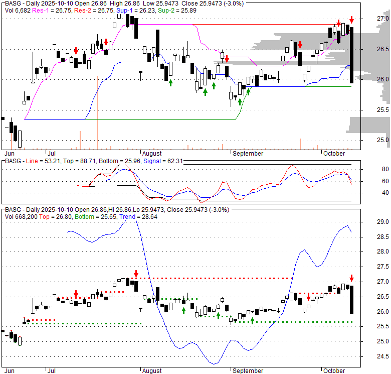 Price has closed below its short-term moving average. Short-term moving average is currently above mid-term; and below long-term moving average. From the relationship between price and moving averages: This stock is NEUTRAL in short-term; and NEUTRAL in mid-long term.[ BASG ] has closed above bottom band by 11.2%. Bollinger Bands are 0% narrower than normal.