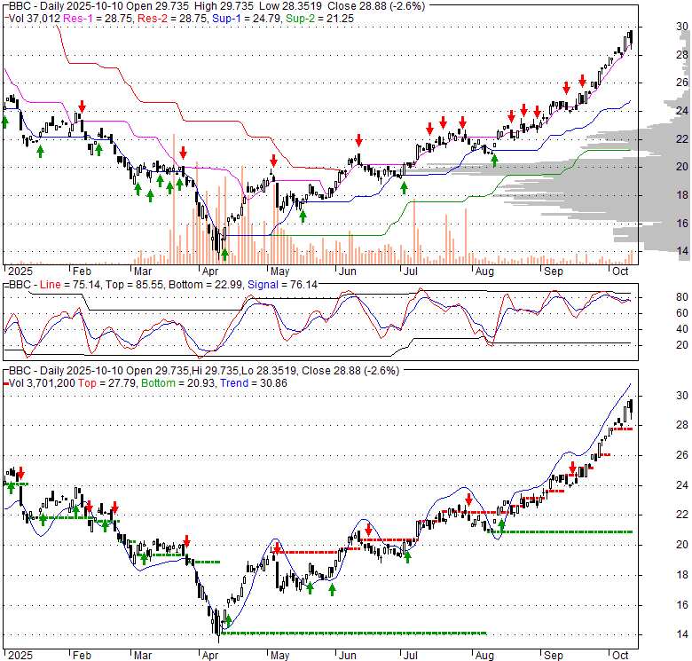 Price has closed above its short-term moving average. Short-term moving average is currently above mid-term; and above long-term moving average. From the relationship between price and moving averages: This stock is BULLISH in short-term; and BULLISH in mid-long term.[ BBC ] has closed below upper band by 21.7%. Bollinger Bands are 96.9% wider than normal. The large width of the bands suggest high volatility as compared to its normal range. The bands have been in this wide range for 9 days. This is a sign that the current trend might continue.