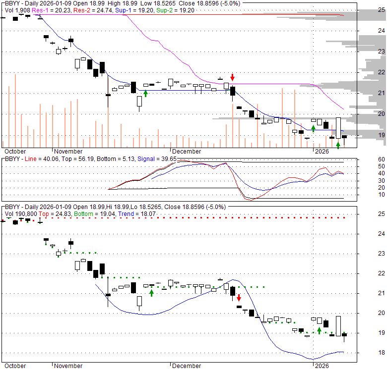 Price has closed below its short-term moving average. Short-term moving average is currently below mid-term; and below long-term moving average. From the relationship between price and moving averages: This stock is BEARISH in short-term; and NEUTRAL in mid-long term.[ BBYY ] has closed above bottom band by 4.7%. Bollinger Bands are 0% narrower than normal.