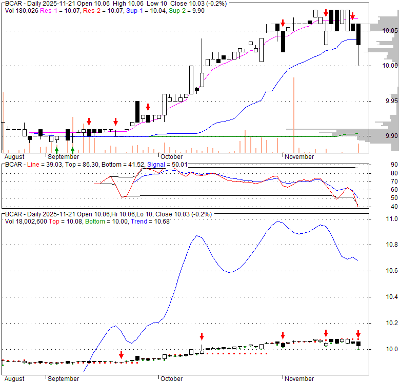Price has closed below its short-term moving average. Short-term moving average is currently above mid-term; and below long-term moving average. From the relationship between price and moving averages: This stock is NEUTRAL in short-term; and NEUTRAL in mid-long term.[ BCAR ] has closed above bottom band by 7.9%. Bollinger Bands are 0% narrower than normal.