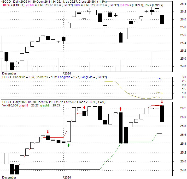 Price has closed below its short-term moving average. Short-term moving average is currently below mid-term; and below long-term moving average. From the relationship between price and moving averages: This stock is NEUTRAL in short-term; and NEUTRAL in mid-long term.[ BCGD ] has closed above bottom band by 37.0%. Bollinger Bands are 0% narrower than normal.