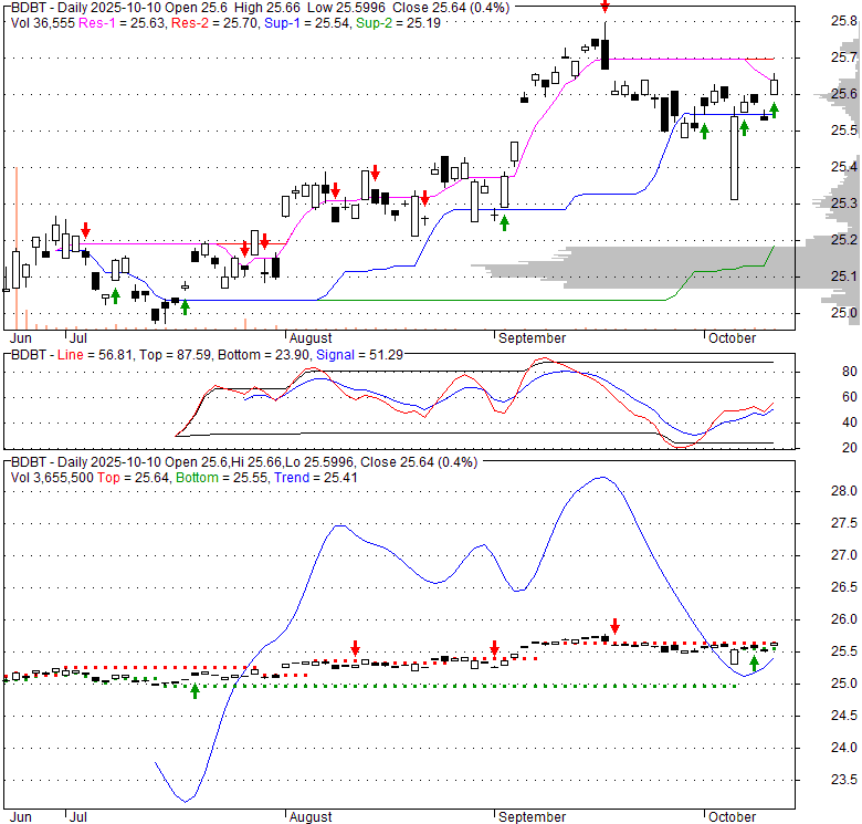 Price has closed above its short-term moving average. Short-term moving average is currently above mid-term; and below long-term moving average. From the relationship between price and moving averages: This stock is BULLISH in short-term; and NEUTRAL in mid-long term.[ BDBT ] has closed below upper band by 7.6%. Bollinger Bands are 0% narrower than normal.