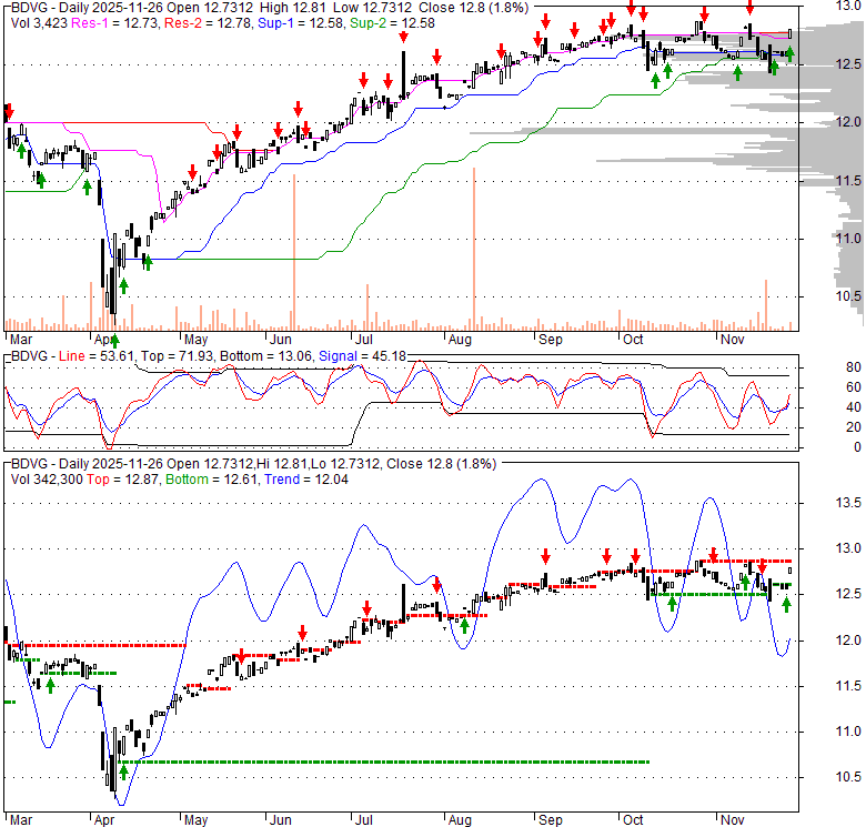 Price has closed above its short-term moving average. Short-term moving average is currently below mid-term; and above long-term moving average. From the relationship between price and moving averages: This stock is NEUTRAL in short-term; and NEUTRAL in mid-long term.[ BDVG ] has closed below upper band by 10.6%. Bollinger Bands are 28.7% wider than normal. The current width of the bands does not suggest anything about the future direction or movement of prices.