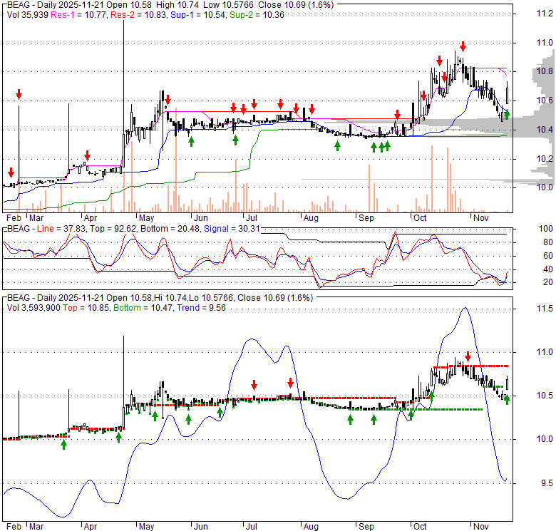 Price has closed above its short-term moving average. Short-term moving average is currently below mid-term; and above long-term moving average. From the relationship between price and moving averages: This stock is NEUTRAL in short-term; and NEUTRAL in mid-long term.[ BEAG ] has closed below upper band by 30.4%. Bollinger Bands are 81.7% wider than normal. The large width of the bands suggest high volatility as compared to its normal range. The bands have been in this wide range for 34 days. This is a sign that the current trend might continue.