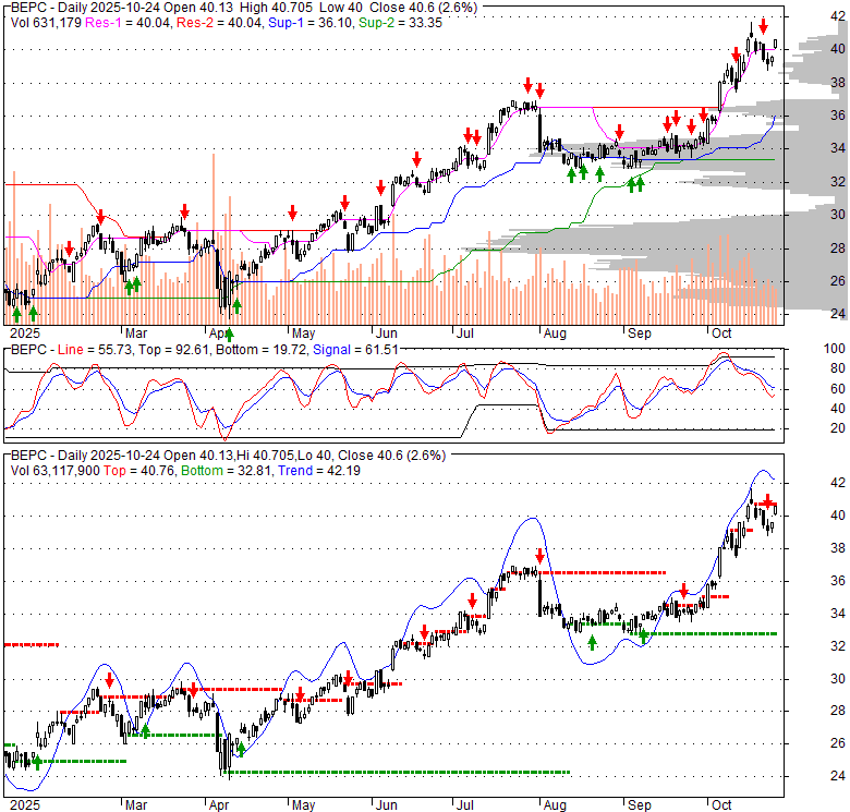 Price has closed above its short-term moving average. Short-term moving average is currently above mid-term; and above long-term moving average. From the relationship between price and moving averages: This stock is BULLISH in short-term; and BULLISH in mid-long term.[ BEPC ] has closed below upper band by 18.8%. Bollinger Bands are 8.2% wider than normal. The current width of the bands does not suggest anything about the future direction or movement of prices.