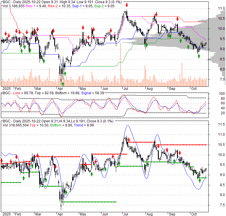 Price has closed above its short-term moving average. Short-term moving average is currently below mid-term; and below long-term moving average. From the relationship between price and moving averages: This stock is NEUTRAL in short-term; and BEARISH in mid-long term.[ BGC ] has closed below upper band by 18.8%. Bollinger Bands are 51.1% narrower than normal. The narrow width of the bands suggests low volatility as compared to its normal range. The bands have been in this narrow range for 2 bars. This is a sign that the market may be about to initiate a new trend.
