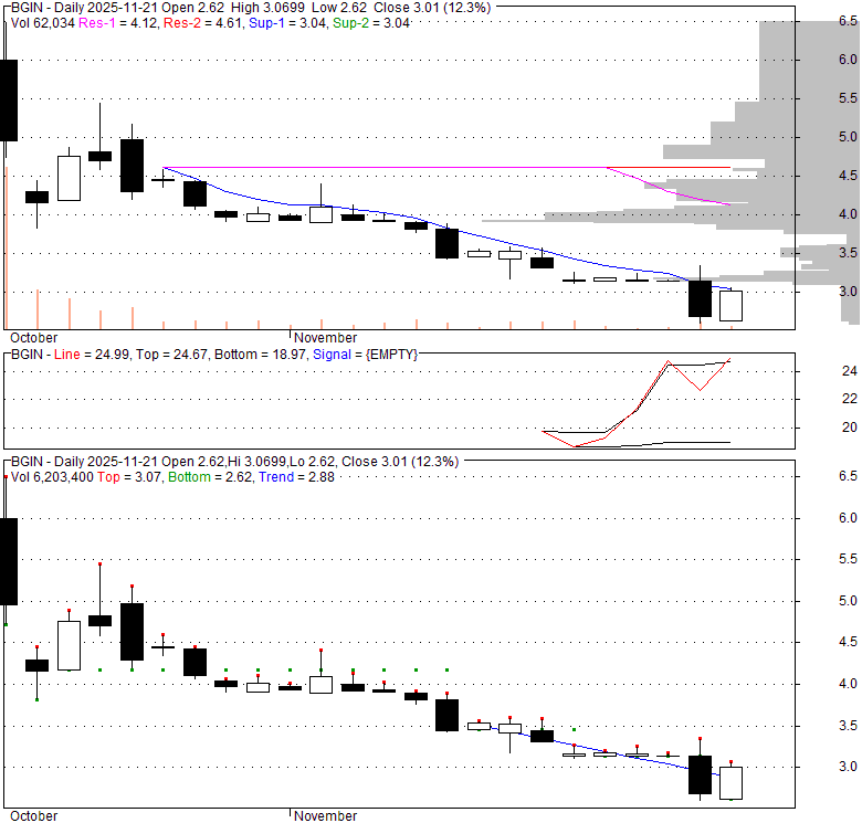 Price has closed below its short-term moving average. Short-term moving average is currently below mid-term; and below long-term moving average. From the relationship between price and moving averages: This stock is NEUTRAL in short-term; and NEUTRAL in mid-long term.[ BGIN ] has closed above bottom band by 22.1%. Bollinger Bands are 0% narrower than normal.