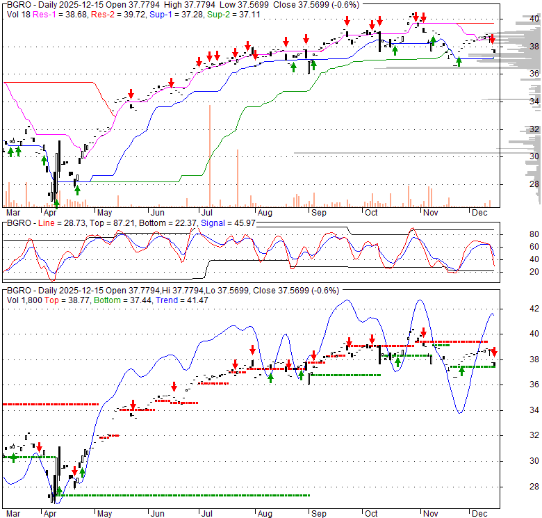 Price has closed below its short-term moving average. Short-term moving average is currently below mid-term; and above long-term moving average. From the relationship between price and moving averages: This stock is BEARISH in short-term; and NEUTRAL in mid-long term.[ BGRO ] has closed above bottom band by 3.2%. Bollinger Bands are 15.5% narrower than normal. The current width of the bands does not suggest anything about the future direction or movement of prices.