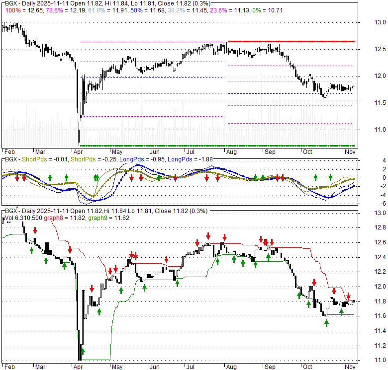 Price has closed above its short-term moving average. Short-term moving average is currently below mid-term; and below long-term moving average. From the relationship between price and moving averages: This stock is NEUTRAL in short-term; and BEARISH in mid-long term.[ BGX ] has closed below upper band by 25.3%. Bollinger Bands are 60.1% narrower than normal. The narrow width of the bands suggests low volatility as compared to its normal range. The bands have been in this narrow range for 1 bars. This is a sign that the market may be about to initiate a new trend.