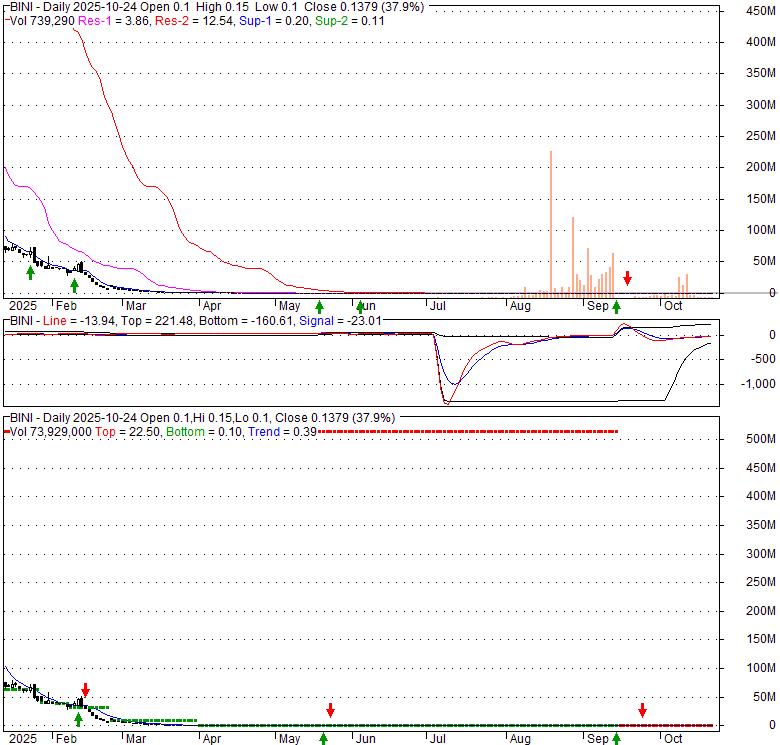 Price has closed above its short-term moving average. Short-term moving average is currently below mid-term; and below long-term moving average. From the relationship between price and moving averages: This stock is NEUTRAL in short-term; and BEARISH in mid-long term.[ BINI ] has closed below the lower bollinger band by {INF}%. Bollinger Bands are 100% narrower than normal. The narrow width of the bands suggests low volatility as compared to its normal range. The bands have been in this narrow range for {EMPTY} bars. This is a sign that the market may be about to initiate a new trend.