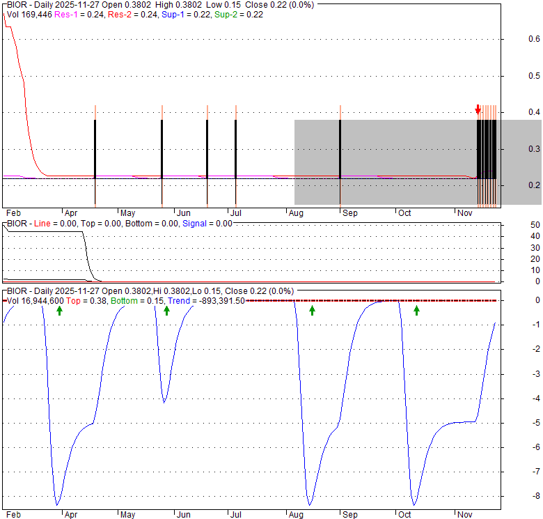 Price has closed below its short-term moving average. Short-term moving average is currently below mid-term; and below long-term moving average. From the relationship between price and moving averages: This stock is NEUTRAL in short-term; and NEUTRAL in mid-long term.[ BIOR ] has closed Bollinger Bands are 0% narrower than normal.