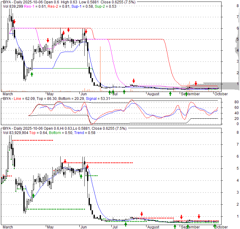 Price has closed above its short-term moving average. Short-term moving average is currently above mid-term; and below long-term moving average. From the relationship between price and moving averages: This stock is BULLISH in short-term; and NEUTRAL in mid-long term.[ BIYA ] has closed above the upper band by 2.5%. If price is in a uptrend band; this upward trend in price might continue. However a short term pullback inside the band is likely.Bollinger Bands are 94.9% narrower than normal. The narrow width of the bands suggests low volatility as compared to its normal range. The bands have been in this narrow range for {EMPTY} bars. This is a sign that the market may be about to initiate a new trend.