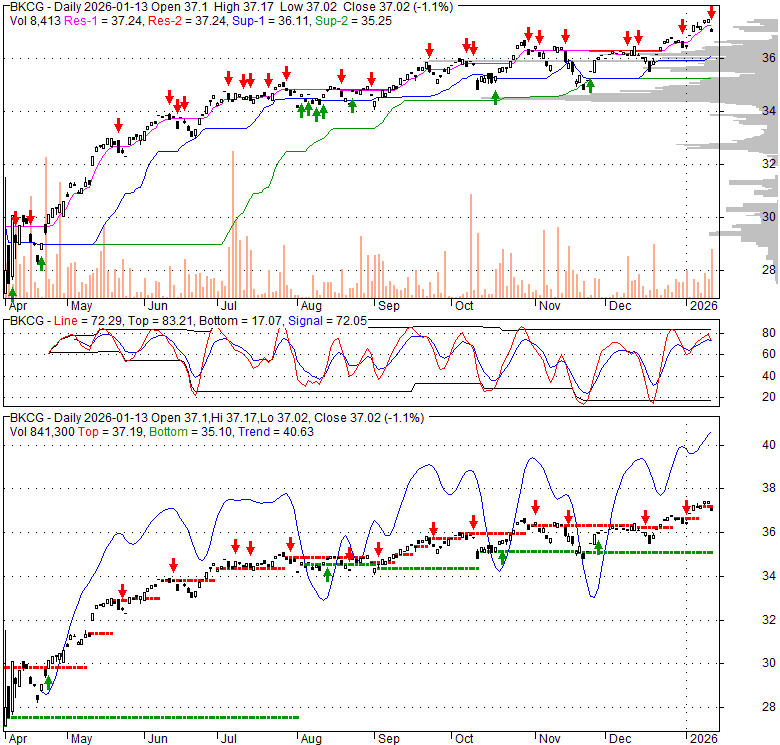 Price has closed below its short-term moving average. Short-term moving average is currently above mid-term; and above long-term moving average. From the relationship between price and moving averages: This stock is NEUTRAL in short-term; and BULLISH in mid-long term.[ BKCG ] has closed below upper band by 39.0%. Bollinger Bands are 5% wider than normal. The current width of the bands does not suggest anything about the future direction or movement of prices.