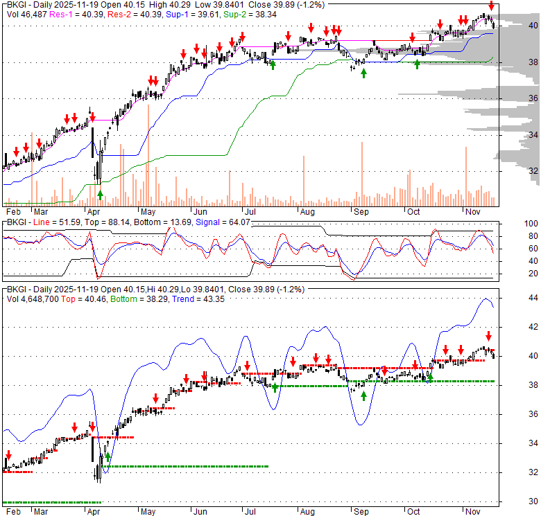 Price has closed below its short-term moving average. Short-term moving average is currently above mid-term; and above long-term moving average. From the relationship between price and moving averages: This stock is NEUTRAL in short-term; and BULLISH in mid-long term.[ BKGI ] has closed above bottom band by 32.5%. Bollinger Bands are 0.7% wider than normal. The current width of the bands does not suggest anything about the future direction or movement of prices.