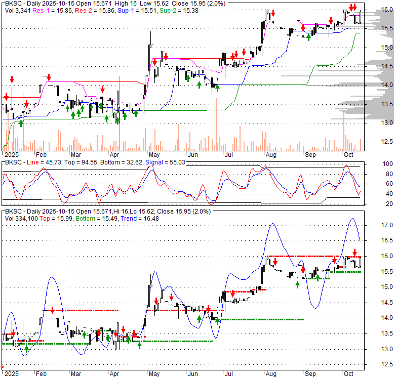 Price has closed above its short-term moving average. Short-term moving average is currently above mid-term; and above long-term moving average. From the relationship between price and moving averages: This stock is BULLISH in short-term; and BULLISH in mid-long term.[ BKSC ] has closed below upper band by 20.1%. Bollinger Bands are 13.2% narrower than normal. The current width of the bands does not suggest anything about the future direction or movement of prices.