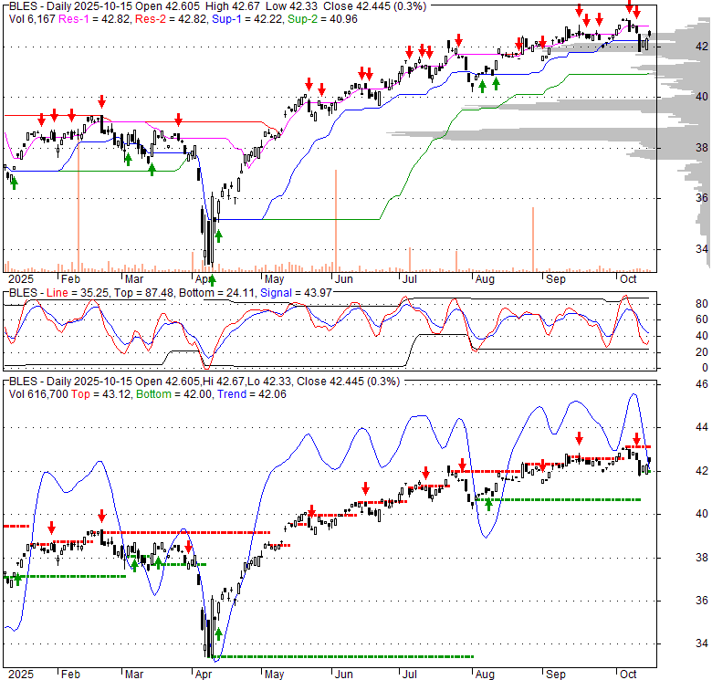 Price has closed above its short-term moving average. Short-term moving average is currently above mid-term; and above long-term moving average. From the relationship between price and moving averages: This stock is BULLISH in short-term; and BULLISH in mid-long term.[ BLES ] has closed below upper band by 42.6%. Bollinger Bands are 6.2% wider than normal. The current width of the bands does not suggest anything about the future direction or movement of prices.
