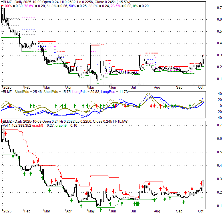 Price has closed above its short-term moving average. Short-term moving average is currently above mid-term; and above long-term moving average. From the relationship between price and moving averages: This stock is BULLISH in short-term; and BULLISH in mid-long term.[ BLMZ ] has closed below upper band by 16.2%. Bollinger Bands are 71.8% wider than normal. The large width of the bands suggest high volatility as compared to its normal range. The bands have been in this wide range for 1 days. This is a sign that the current trend might continue.
