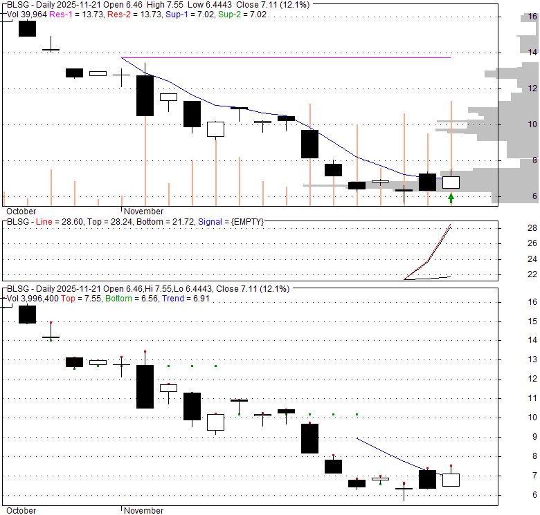 Price has closed above its short-term moving average. Short-term moving average is currently below mid-term; and below long-term moving average. From the relationship between price and moving averages: This stock is NEUTRAL in short-term; and NEUTRAL in mid-long term.[ BLSG ] has closed above bottom band by 27.6%. Bollinger Bands are 0% narrower than normal.