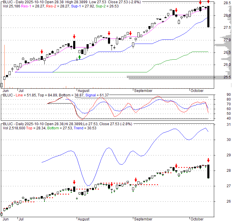 Price has closed below its short-term moving average. Short-term moving average is currently above mid-term; and below long-term moving average. From the relationship between price and moving averages: This stock is NEUTRAL in short-term; and NEUTRAL in mid-long term.[ BLUC ] has closed below the lower bollinger band by 14.2%. Bollinger Bands are 0% narrower than normal.