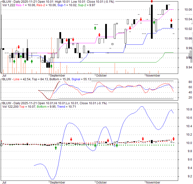Price has closed below its short-term moving average. Short-term moving average is currently above mid-term; and below long-term moving average. From the relationship between price and moving averages: This stock is NEUTRAL in short-term; and NEUTRAL in mid-long term.[ BLUW ] has closed above bottom band by 17.1%. Bollinger Bands are 0% narrower than normal.