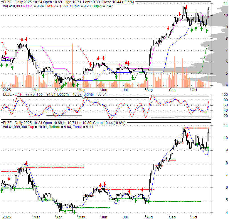 Price has closed above its short-term moving average. Short-term moving average is currently above mid-term; and above long-term moving average. From the relationship between price and moving averages: This stock is BULLISH in short-term; and BULLISH in mid-long term.[ BLZE ] has closed Bollinger Bands are 15.1% wider than normal. The current width of the bands does not suggest anything about the future direction or movement of prices.