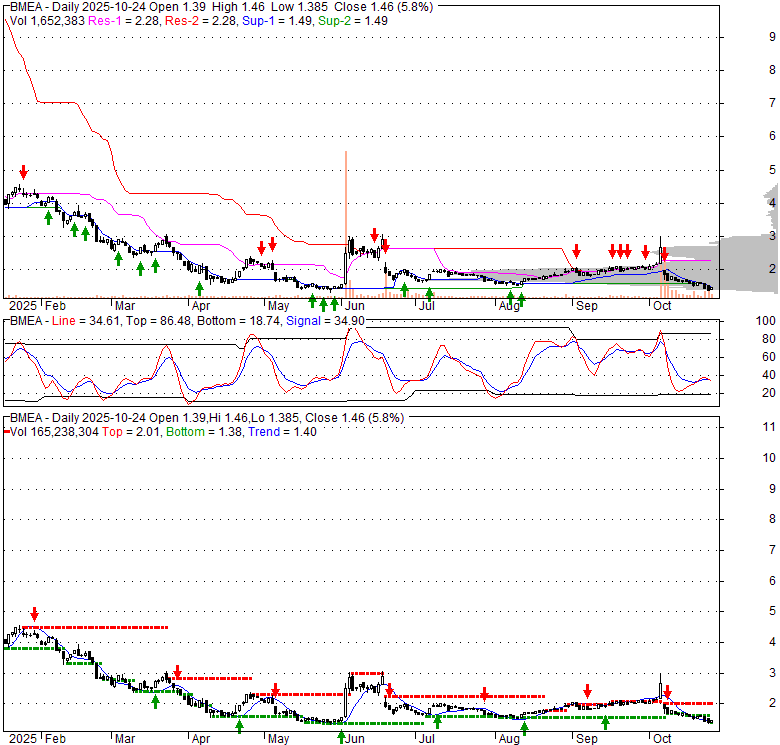Price has closed below its short-term moving average. Short-term moving average is currently below mid-term; and below long-term moving average. From the relationship between price and moving averages: This stock is BEARISH in short-term; and BEARISH in mid-long term.[ BMEA ] has closed above bottom band by 31.1%. Bollinger Bands are 47.3% wider than normal. The large width of the bands suggest high volatility as compared to its normal range. The bands have been in this wide range for 8 days. This is a sign that the current trend might continue.