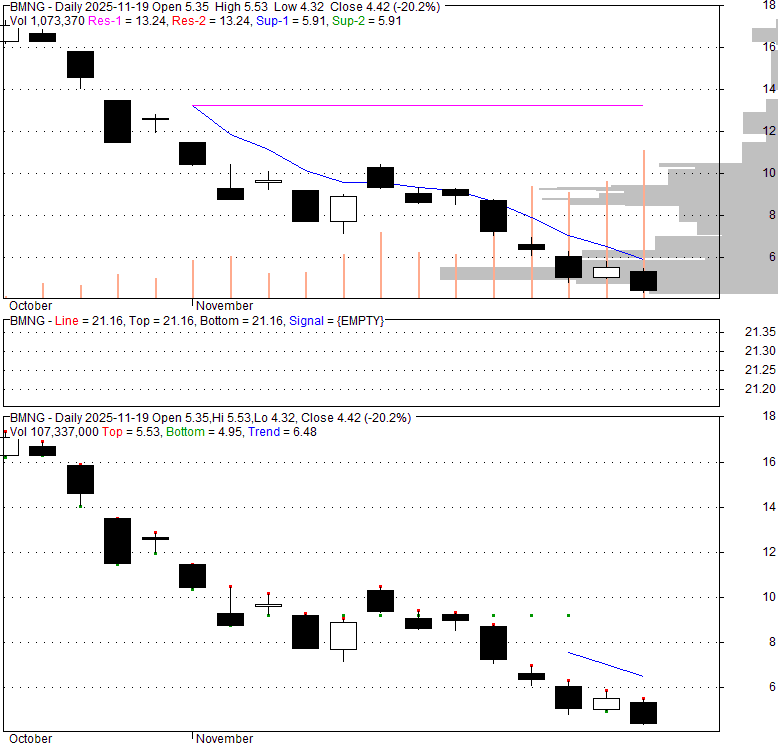 Price has closed below its short-term moving average. Short-term moving average is currently below mid-term; and below long-term moving average. From the relationship between price and moving averages: This stock is NEUTRAL in short-term; and NEUTRAL in mid-long term.[ BMNG ] has closed above bottom band by 6.2%. Bollinger Bands are 0% narrower than normal.