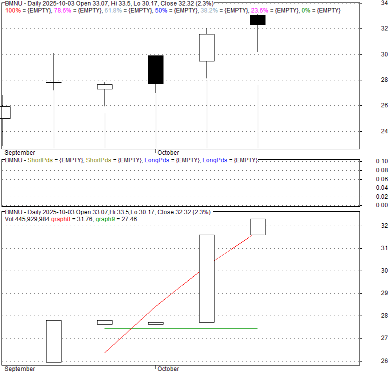 Price has closed above its short-term moving average. Short-term moving average is currently below mid-term; and below long-term moving average. From the relationship between price and moving averages: This stock is NEUTRAL in short-term; and NEUTRAL in mid-long term.[ BMNU ] has closed Bollinger Bands are 0% narrower than normal.