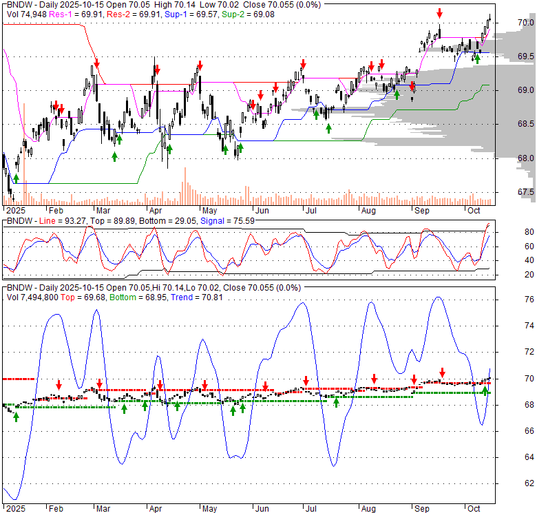 Price has closed above its short-term moving average. Short-term moving average is currently above mid-term; and above long-term moving average. From the relationship between price and moving averages: This stock is BULLISH in short-term; and BULLISH in mid-long term.[ BNDW ] has closed Bollinger Bands are 11.7% wider than normal. The current width of the bands does not suggest anything about the future direction or movement of prices.