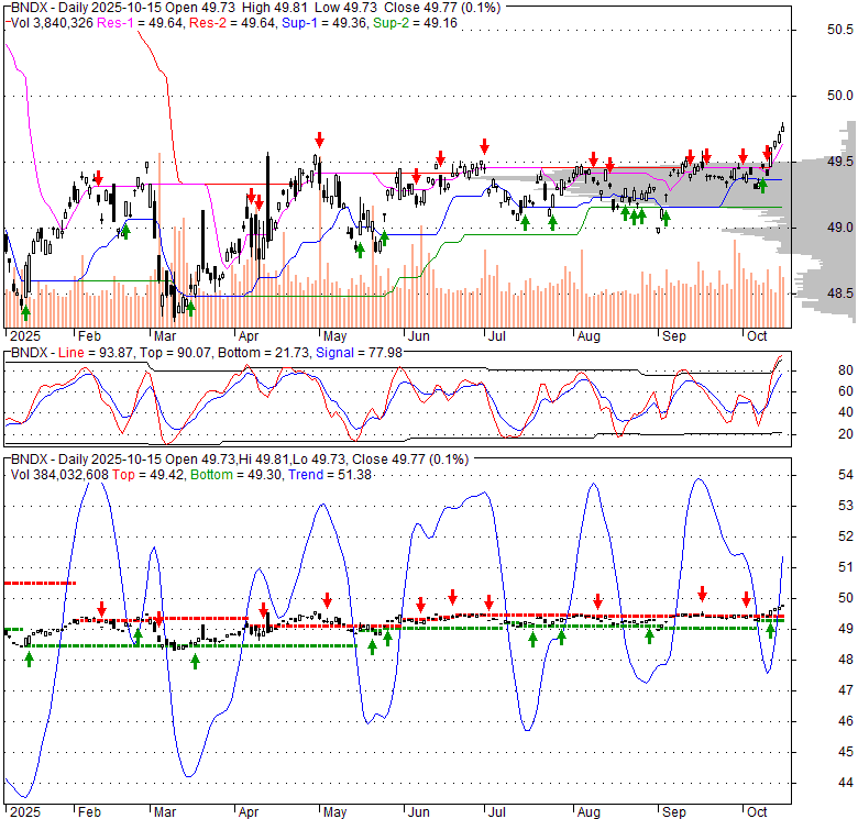 Price has closed above its short-term moving average. Short-term moving average is currently above mid-term; and above long-term moving average. From the relationship between price and moving averages: This stock is BULLISH in short-term; and BULLISH in mid-long term.[ BNDX ] has closed It is unclear right now based on current values. 40.6% wider than normal. The large width of the bands suggest high volatility as compared to its normal range. The bands have been in this wide range for 0 days. This is a sign that the current trend might continue.