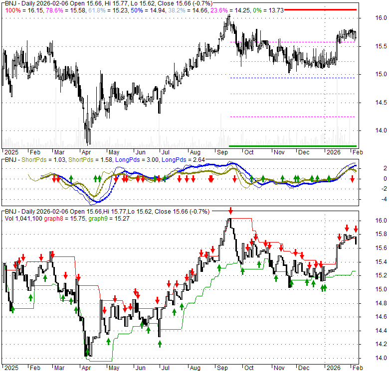 Price has closed below its short-term moving average. Short-term moving average is currently above mid-term; and above long-term moving average. From the relationship between price and moving averages: This stock is NEUTRAL in short-term; and NEUTRAL in mid-long term.[ BNJ ] has closed above bottom band by 25.5%. Bollinger Bands are 50.6% narrower than normal. The narrow width of the bands suggests low volatility as compared to its normal range. The bands have been in this narrow range for 1 bars. This is a sign that the market may be about to initiate a new trend.