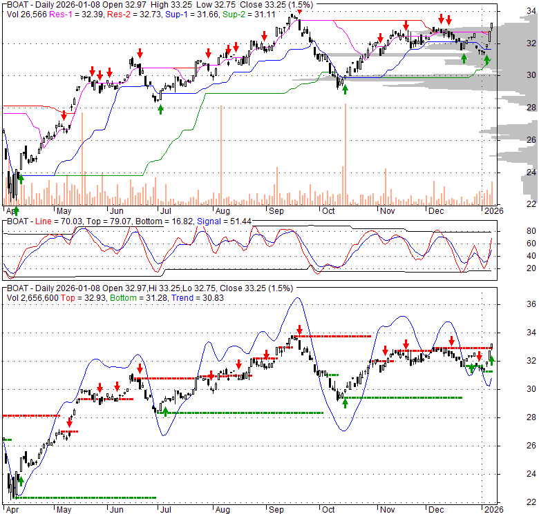 Price has closed above its short-term moving average. Short-term moving average is currently below mid-term; and above long-term moving average. From the relationship between price and moving averages: This stock is NEUTRAL in short-term; and NEUTRAL in mid-long term.[ BOAT ] has closed Bollinger Bands are 5.5% narrower than normal. The current width of the bands does not suggest anything about the future direction or movement of prices.
