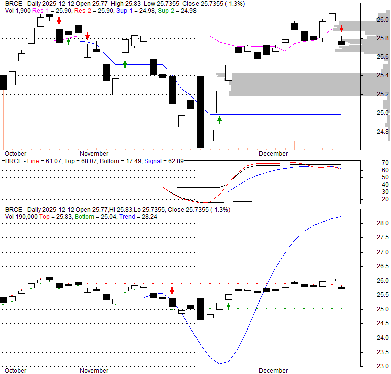 Price has closed below its short-term moving average. Short-term moving average is currently below mid-term; and below long-term moving average. From the relationship between price and moving averages: This stock is NEUTRAL in short-term; and NEUTRAL in mid-long term.[ BRCE ] has closed below upper band by 43.6%. Bollinger Bands are 0% narrower than normal.