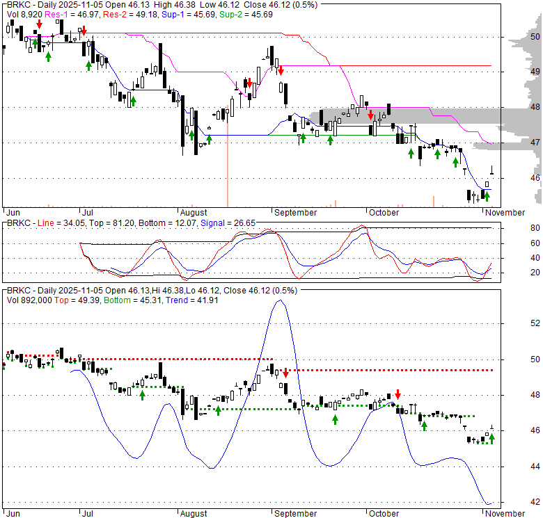 Price has closed above its short-term moving average. Short-term moving average is currently below mid-term; and below long-term moving average. From the relationship between price and moving averages: This stock is NEUTRAL in short-term; and BEARISH in mid-long term.[ BRKC ] has closed above bottom band by 41.8%. Bollinger Bands are 0% narrower than normal.