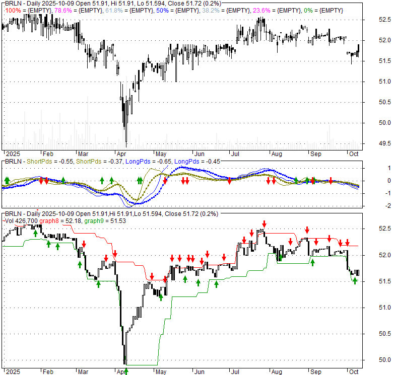 Price has closed below its short-term moving average. Short-term moving average is currently below mid-term; and below long-term moving average. From the relationship between price and moving averages: This stock is BEARISH in short-term; and NEUTRAL in mid-long term.[ BRLN ] has closed above bottom band by 21.3%. Bollinger Bands are 64.6% wider than normal. The large width of the bands suggest high volatility as compared to its normal range. The bands have been in this wide range for 3 days. This is a sign that the current trend might continue.