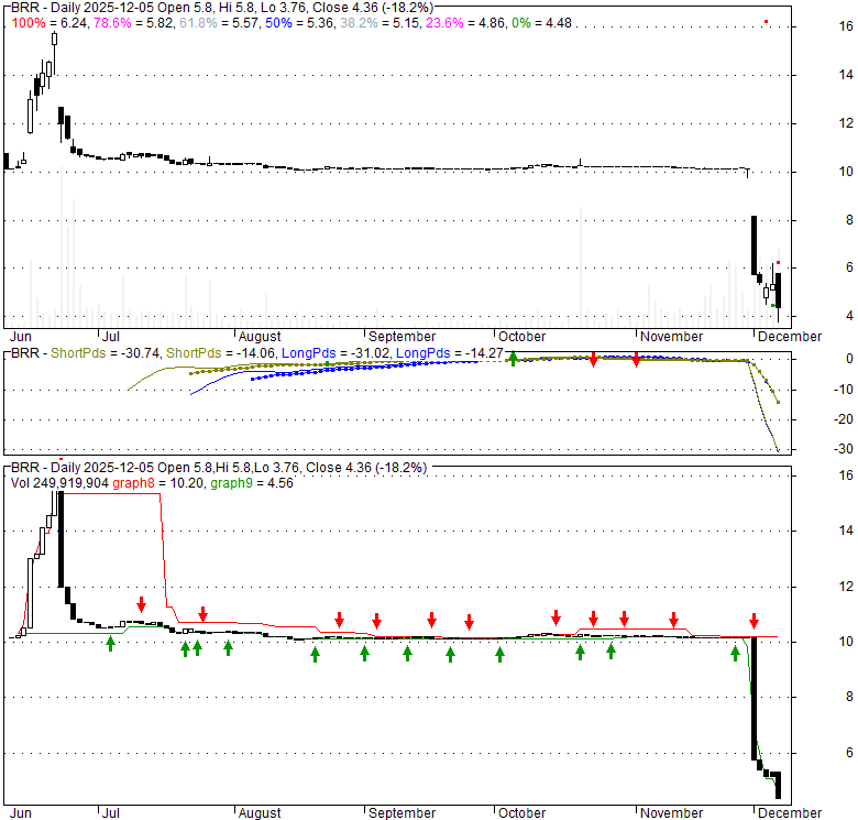 Price has closed below its short-term moving average. Short-term moving average is currently below mid-term; and below long-term moving average. From the relationship between price and moving averages: This stock is BEARISH in short-term; and BEARISH in mid-long term.[ BRR ] has closed above bottom band by 5.8%. Bollinger Bands are 1585.6% wider than normal. The large width of the bands suggest high volatility as compared to its normal range. The bands have been in this wide range for 4 days. This is a sign that the current trend might continue.