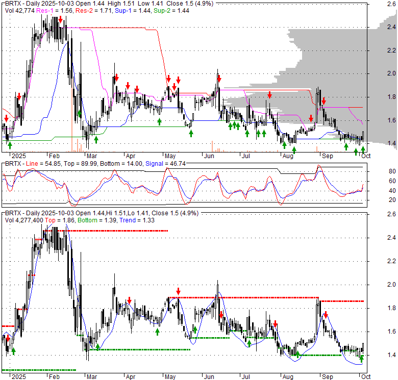 Price has closed above its short-term moving average. Short-term moving average is currently below mid-term; and below long-term moving average. From the relationship between price and moving averages: This stock is NEUTRAL in short-term; and BEARISH in mid-long term.[ BRTX ] has closed below upper band by 5.0%. Bollinger Bands are 68.6% narrower than normal. The narrow width of the bands suggests low volatility as compared to its normal range. The bands have been in this narrow range for 2 bars. This is a sign that the market may be about to initiate a new trend.