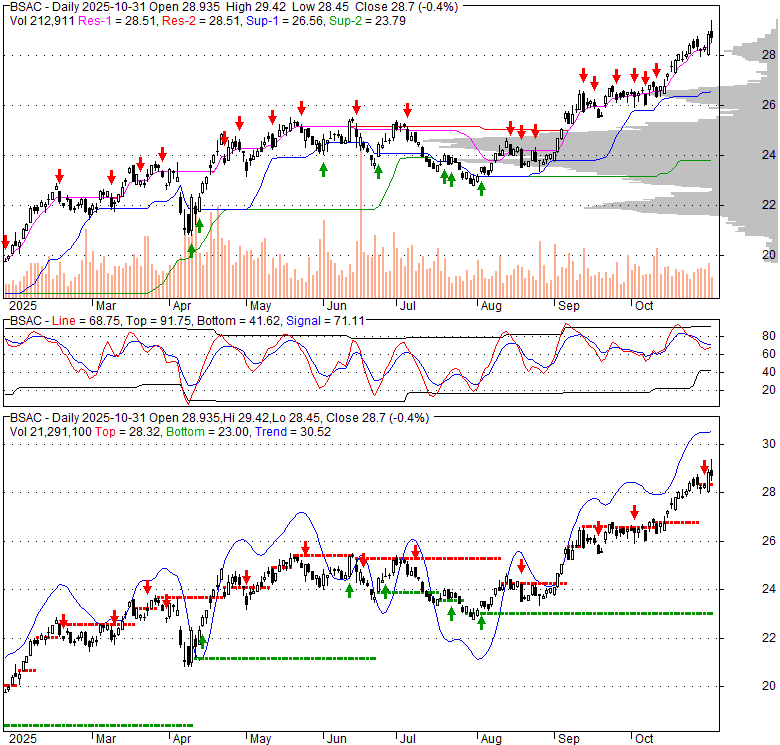 Price has closed above its short-term moving average. Short-term moving average is currently above mid-term; and above long-term moving average. From the relationship between price and moving averages: This stock is BULLISH in short-term; and BULLISH in mid-long term.[ BSAC ] has closed below upper band by 18.7%. Bollinger Bands are 30.5% wider than normal. The current width of the bands does not suggest anything about the future direction or movement of prices.