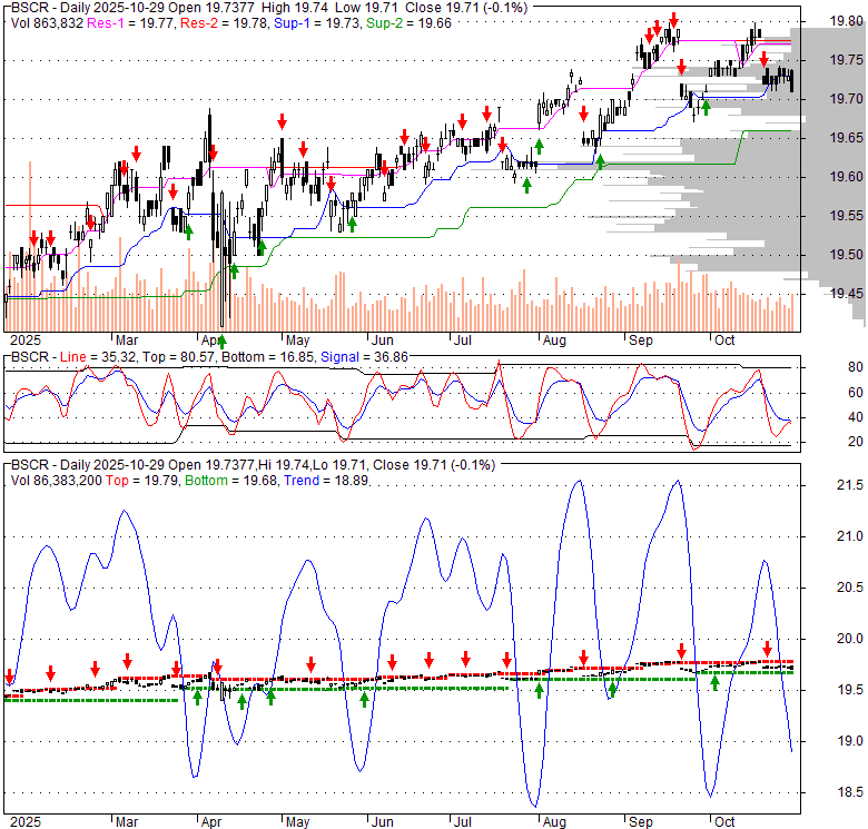 Price has closed below its short-term moving average. Short-term moving average is currently below mid-term; and above long-term moving average. From the relationship between price and moving averages: This stock is BEARISH in short-term; and NEUTRAL in mid-long term.[ BSCR ] has closed above bottom band by 17.5%. Bollinger Bands are 13.6% narrower than normal. The current width of the bands does not suggest anything about the future direction or movement of prices.