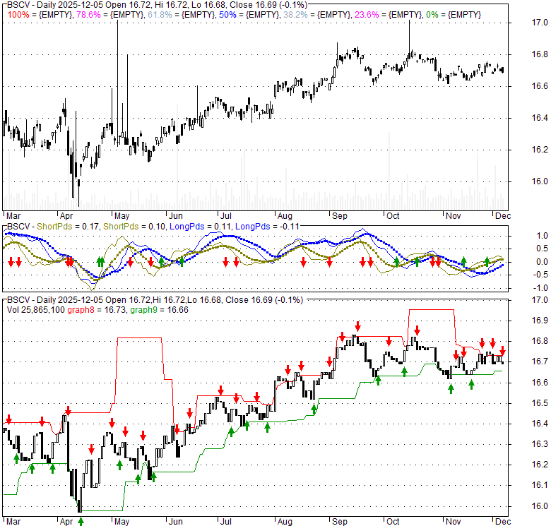 Price has closed below its short-term moving average. Short-term moving average is currently below mid-term; and above long-term moving average. From the relationship between price and moving averages: This stock is BEARISH in short-term; and NEUTRAL in mid-long term.[ BSCV ] has closed above bottom band by 26.1%. Bollinger Bands are 34.8% narrower than normal. The current width of the bands does not suggest anything about the future direction or movement of prices.